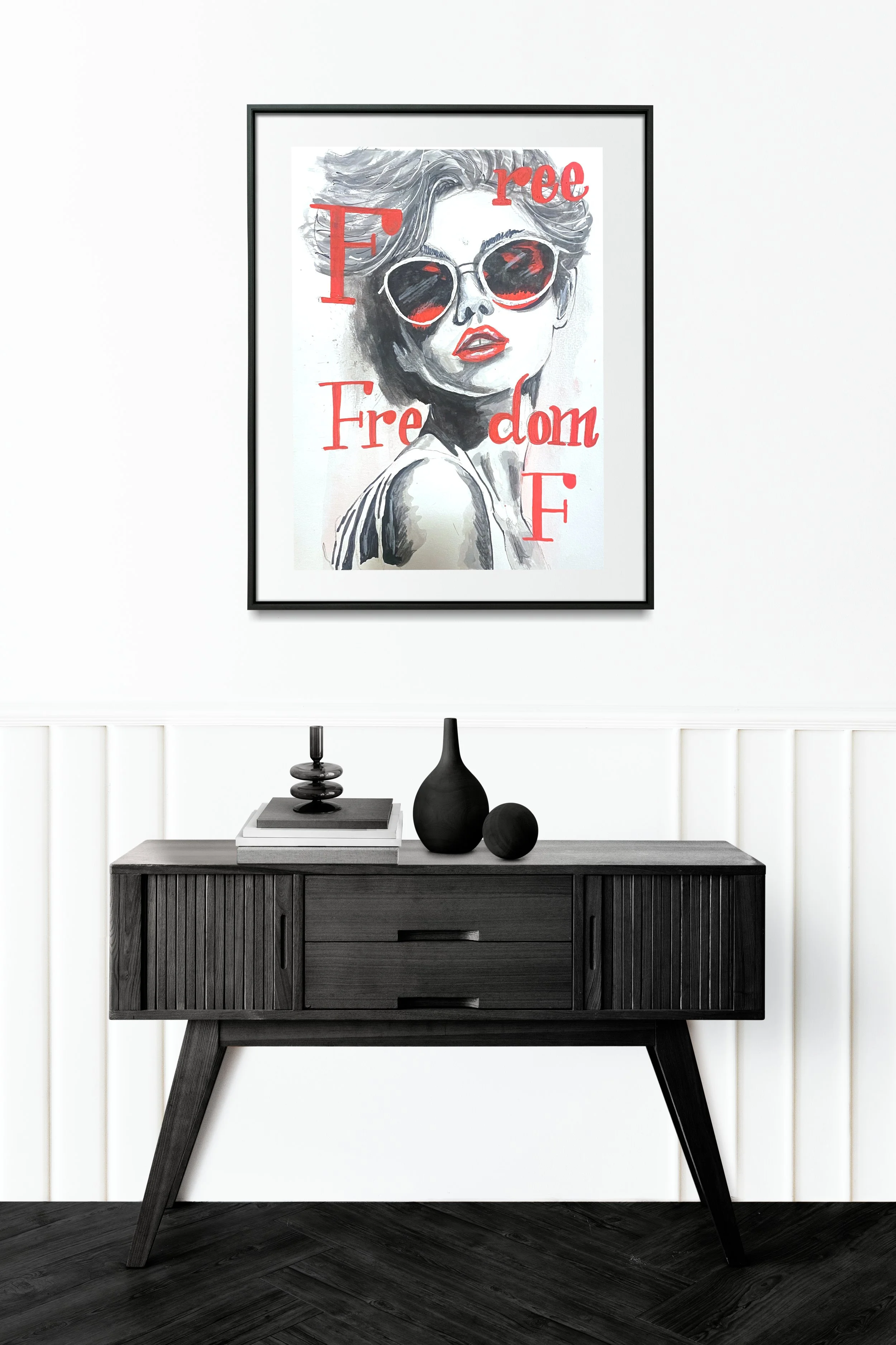 Dieses A3-Aquarell steht für Selbstbestimmung und innere Freiheit. Der Blick der Figur wirkt ruhig, fast losgelöst, während die rote Typografie bewusst Akzente setzt und den Freiheitsbegriff visuell unterstreicht. Leichte, offene Aquarellflächen treffen auf markante Kontraste und schaffen eine Balance zwischen Stärke und Verletzlichkeit.